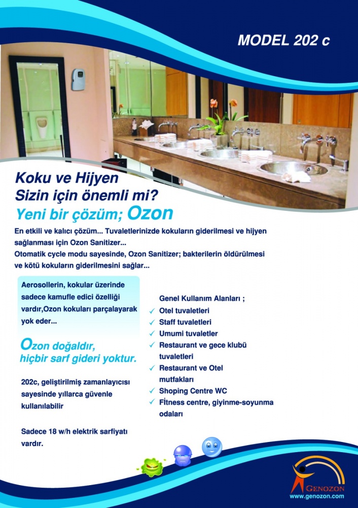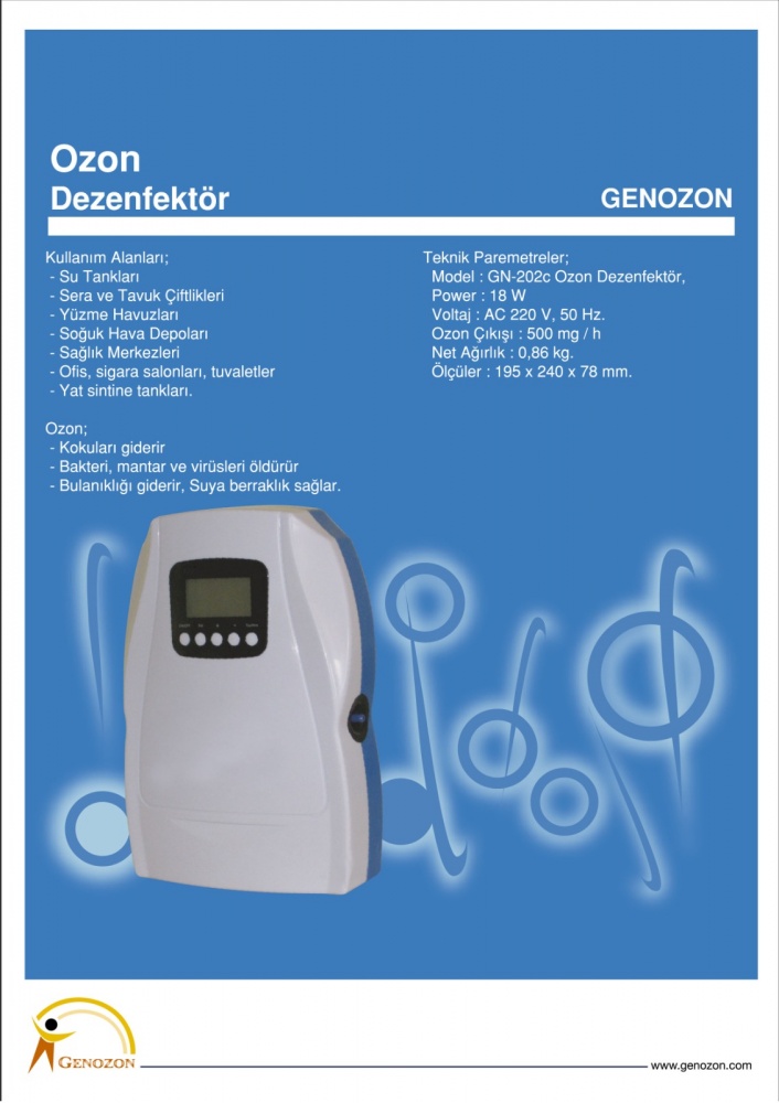 Kullanım Alanları: - Su Tankları - Sera ve Tavuk Çiftlikleri - Yüzme Havuzları - Soğuk Hava Depoları - Sağlık merkezleri - Ofis, sigara salonları,tuvaletler - Yat sintine tankları, Ozon; - Havayı Temizler , İstenmeyen Kokuları giderir - Bakteri,mantar ve virüsleri öldürür - Bulanıklığı giderir,Suya berraklık sağlar. |